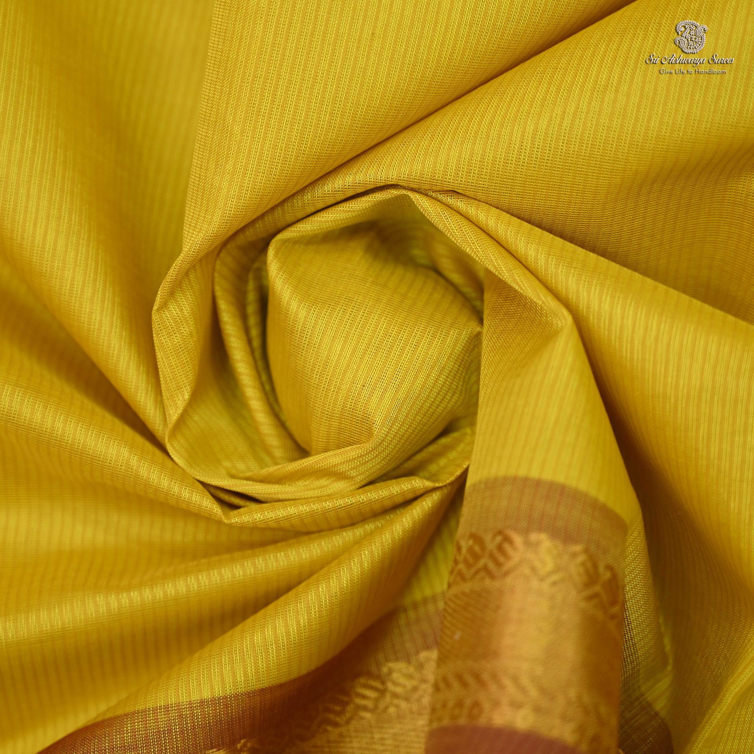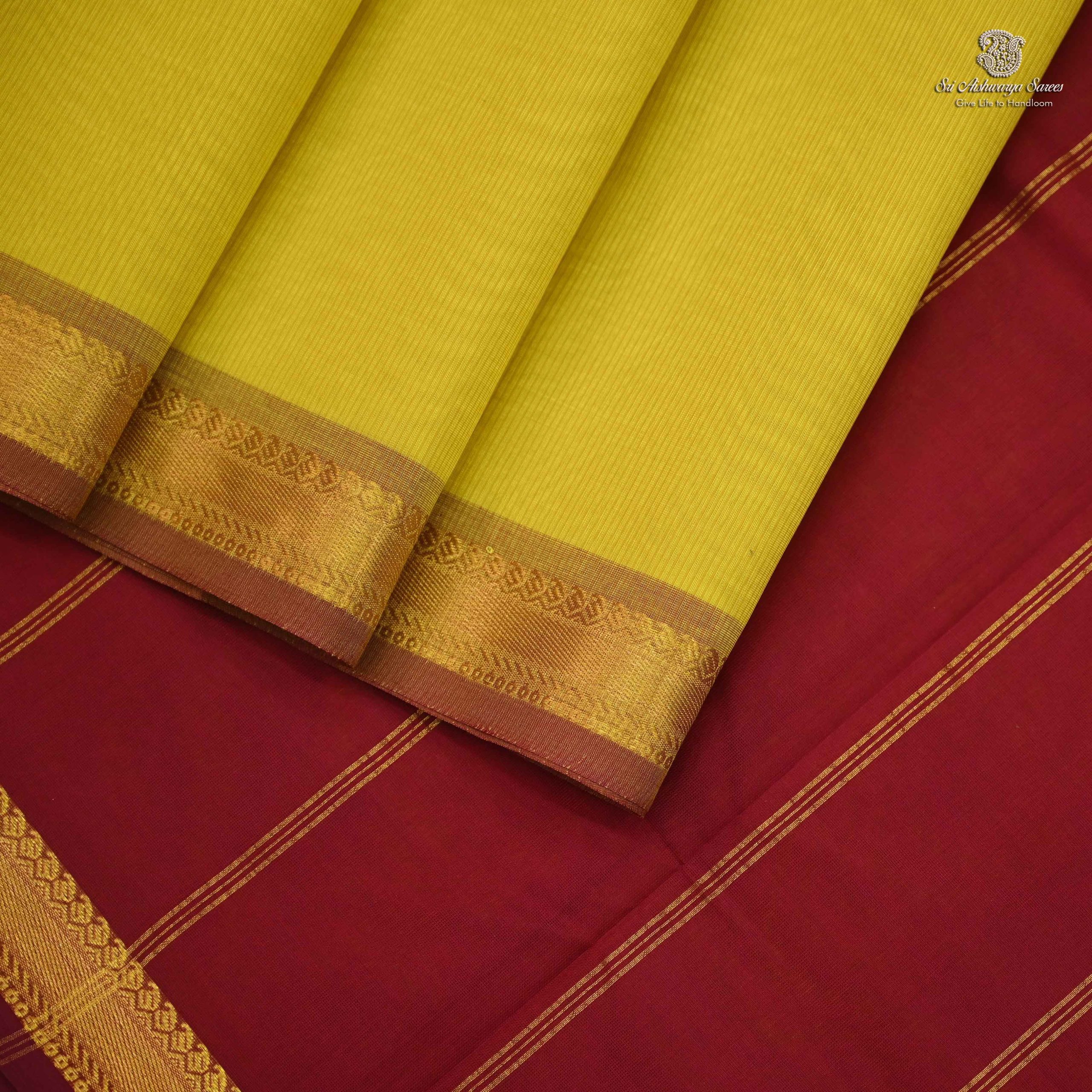 Pure silk cotton saree with a Sampangi Yellow body and simple Burgundy Pink pallu, its pure vibrant and blended elegance with traditional charm.