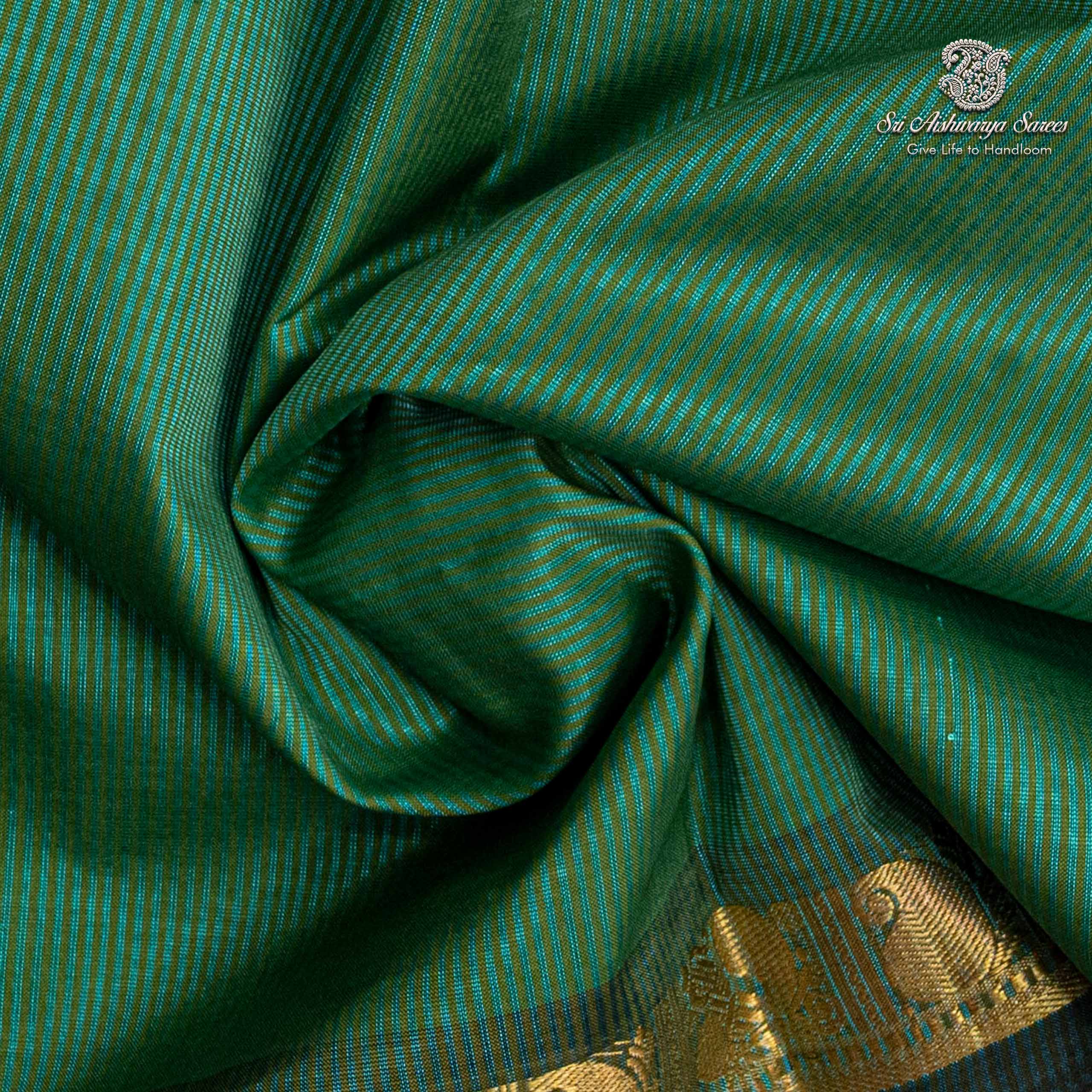 Pure silk cotton saree with a seafoam green body and dark brown pallu. A vibrant handloom piece blending elegance with traditional charm.