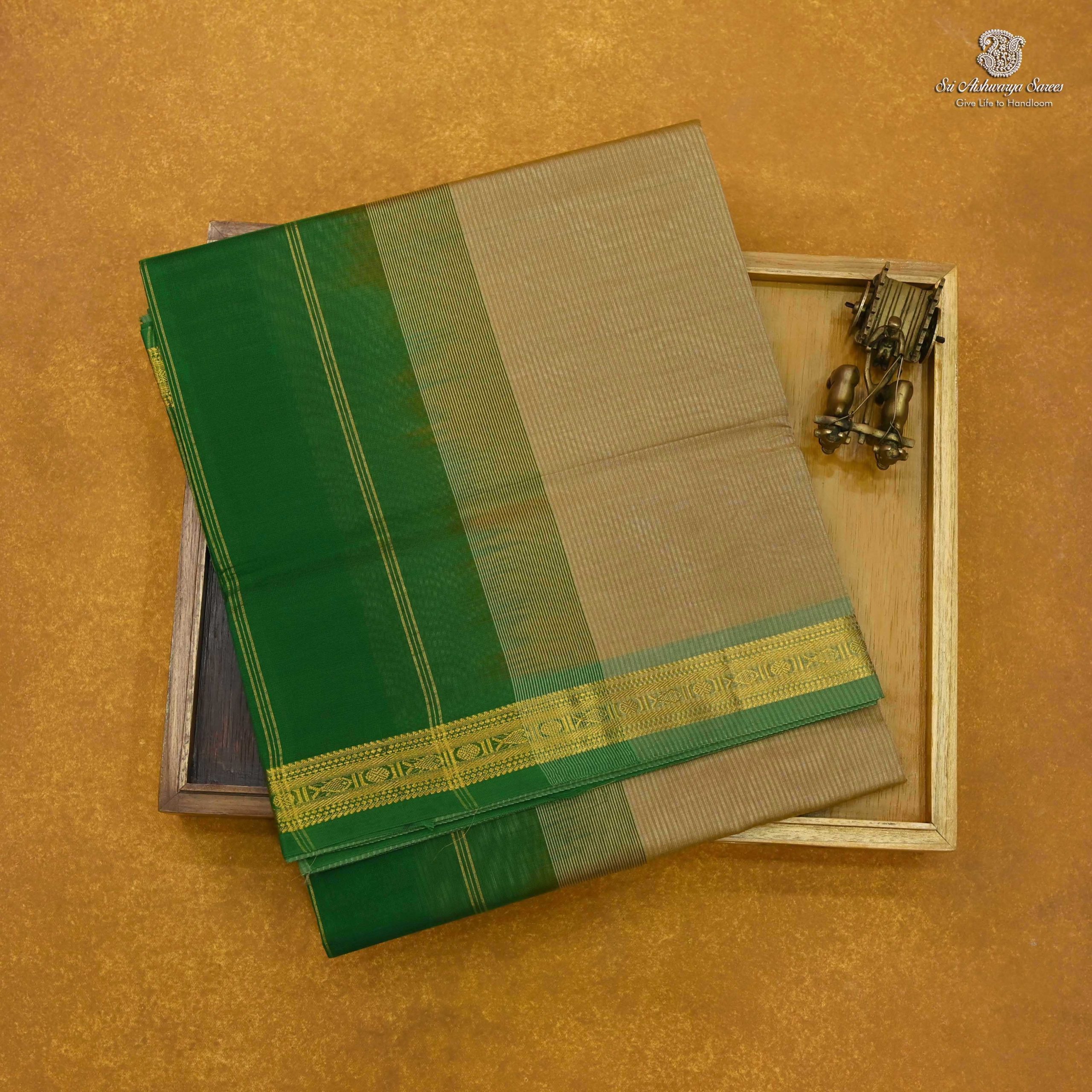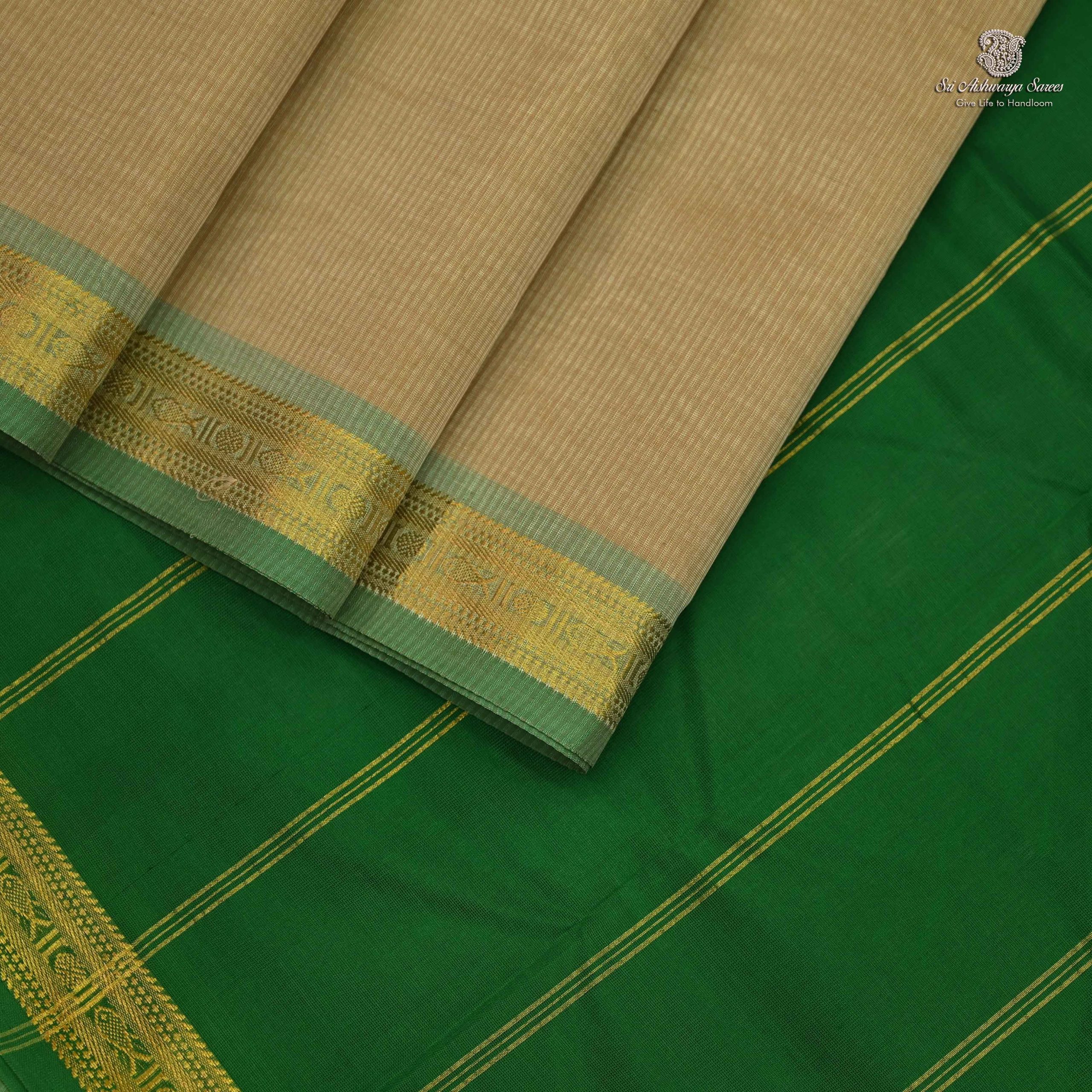 Pure silk cotton saree with a Wheat Tan body and simple Medium Green pallu, its pure vibrant and blended elegance with traditional charm.
